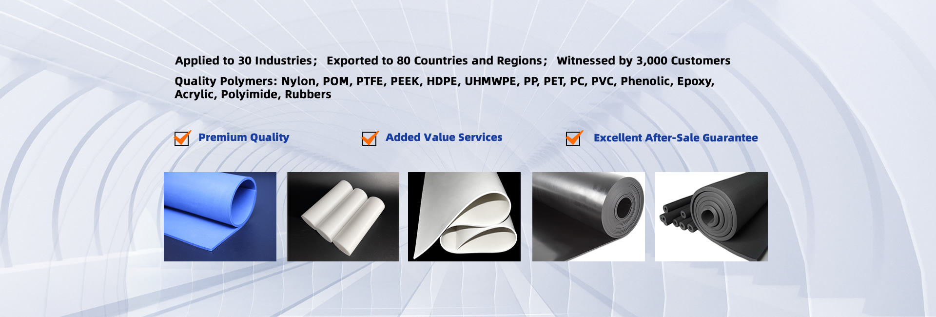 Polymer Products such as SBR Rubbers, EPDM rubbers, Nylon Sheets, Nylon Rods, Nylon Tubes, PA Rods, PA Sheets, PC Sheets , POM Sheets, POM Rods, PP Sheets, PP Rods, PET Sheets, PET Rods, PVC Sheets, PTFE Sheets, PTFE Rods, PTFE Tubes, PEEK Sheets, HDPE Sheets, HDPE Rods, UHMWPE Sheets, UHMWPE Rods, Phenolic Cotton Sheets, Phenolic Cotton Rods, Epoxy Glass Sheets, Acrylic Sheets, and so on.