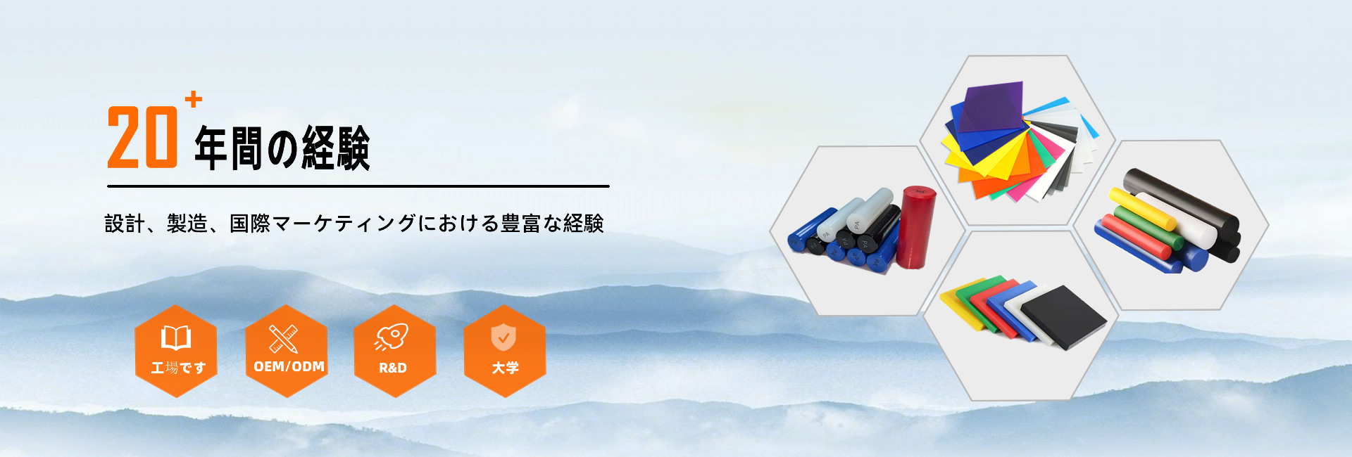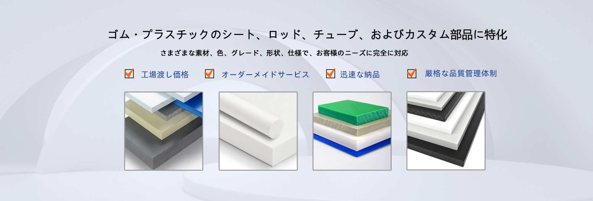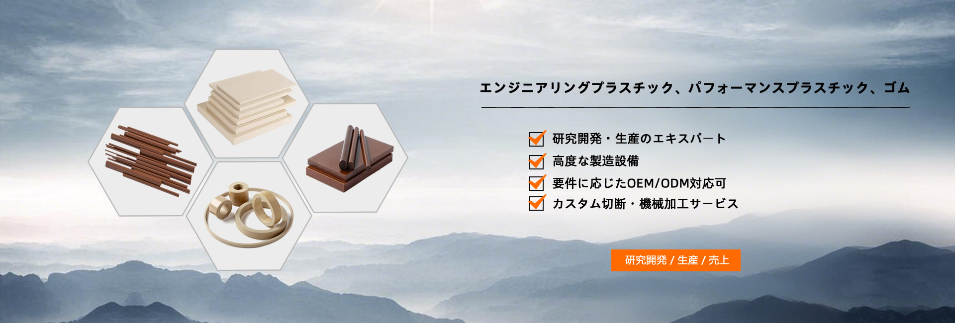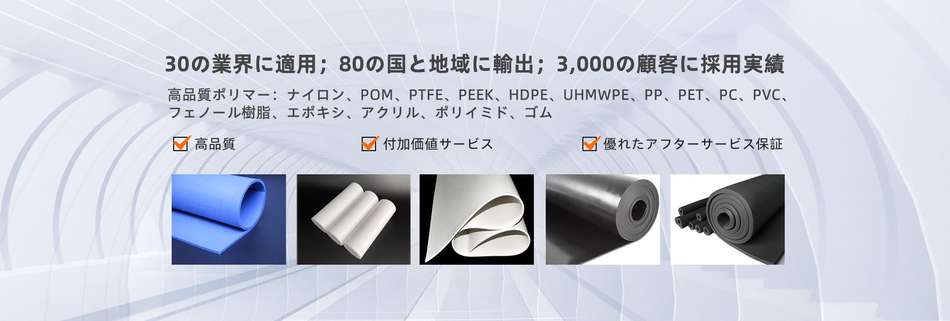 ポリマー製品として、SBRゴム、EPDMゴム、ナイロンシート、ナイロンロッド、ナイロンチューブ、PAロッド、PAシート、PCシート、POMシート、POMロッド、PPシート、PPロッド、PETシート、PETロッド、PVCシート、PTFEシート、PTFEロ ッ ド、PTFEチューブ、PEEKシート、HDPEシート、HDPEロッド、UHMWPEシート、UHMWPEロッド、フェノール綿シート、フェノール綿ロッド、エポキシガラスシート、アクリルシートなどがあります。