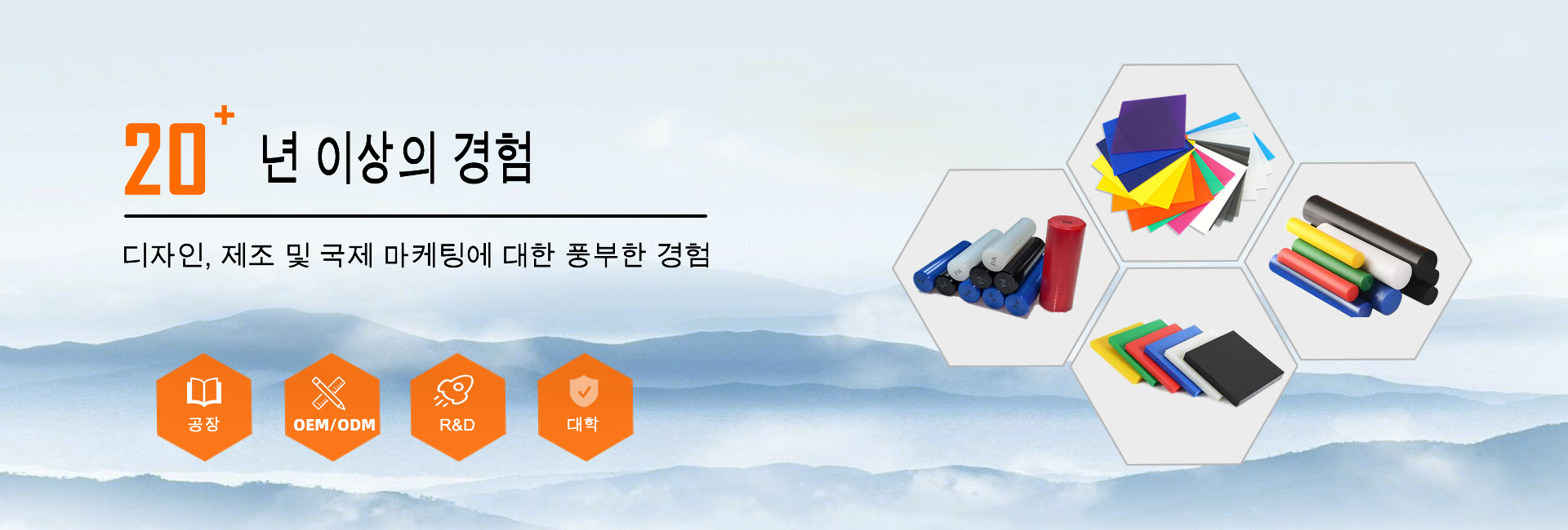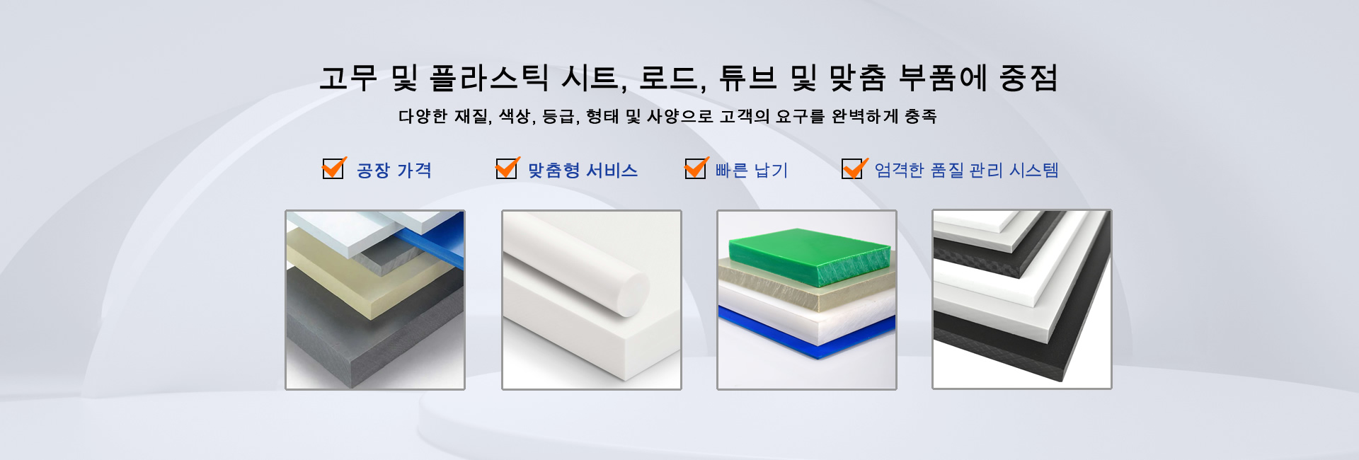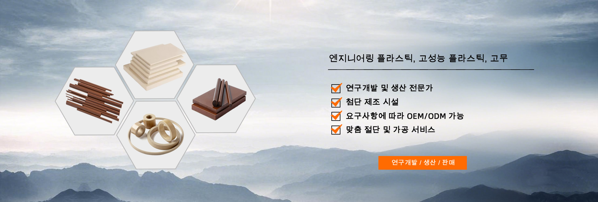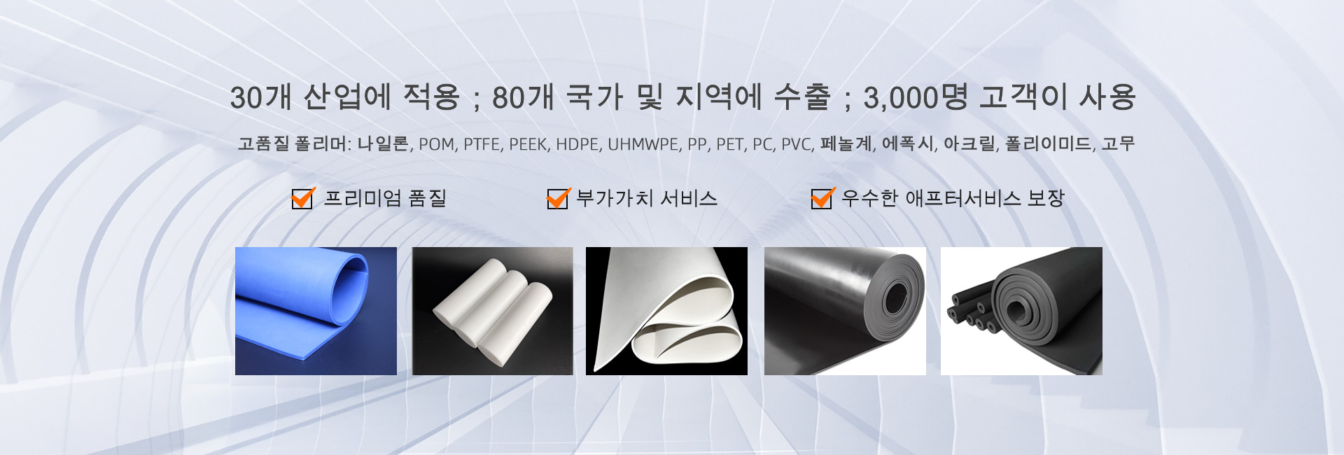 폴리머 제품으로는 SBR 고무, EPDM 고무, 나일론 시트, 나일론 로드, 나일론 튜브, PA 로드, PA 시트, PC 시트, POM 시트, POM 로드, PP 시트, PP 로드, PET 시트, PET 로드, PVC 시트, PTFE 시트, PTFE 로드, PTFE 튜브, PEEK 시트, HDPE 시트, HDPE 로드, UHMWPE 시트, UHMWPE 로드, 페놀 면 시트, 페놀 면 로드, 에폭시 유리 시트, 아크릴 시트 등이 있습니다.